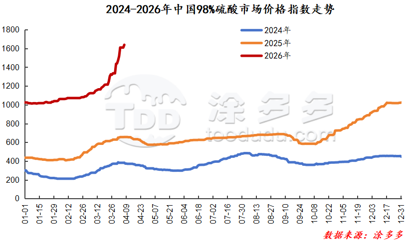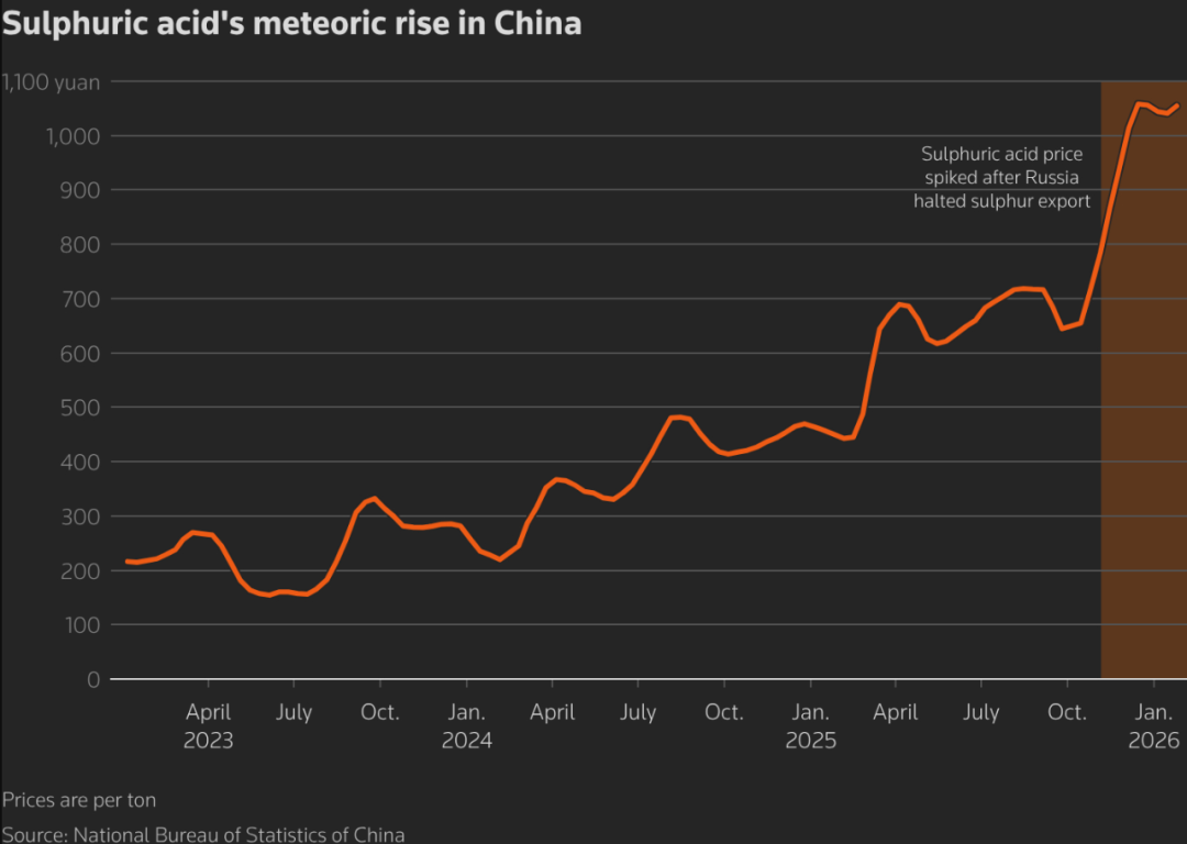 中国的硫酸市场价。俄罗斯停止硫磺出口后,硫酸价格飙升