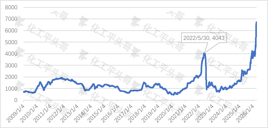全球四分之一的硫磺,产自中东。全球一半的海运硫磺贸易,通过霍尔木兹海峡那条狭窄的蓝色水道。伊朗冲突的升级,让这条水道变成了一道随时可能封闭的隘口。船舶滞留、战争保险费率飙升、船东拒绝前往——这些港口传来的坏消息,最终转化成中国港口硫磺价格图上一根陡峭的红线:每吨价格从4750元一跃至6750元。