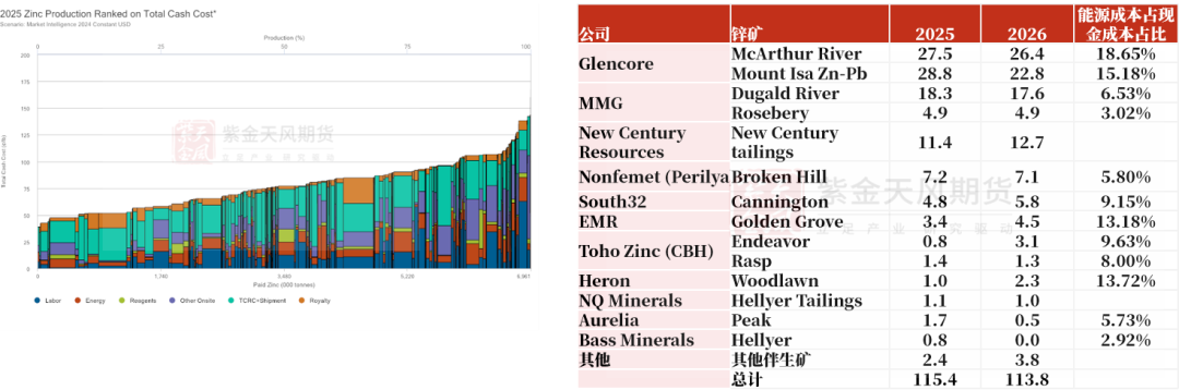 根据标普全球 2025 年最新矿山成本数据,TC 加工费及船运费用为锌矿现金成本的第一大构成项,能源成本占比相对偏低。