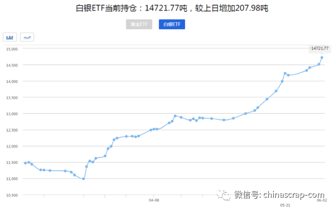 另外,白银ETF持仓快速增长也利好银价。6月2日黄金ETF持仓量较前日增加0.88吨至1129.28吨,为七年来最高。白银ETF持仓量较前日增加207.98吨至14721.77吨,过去一个月,白银支持的交易所交易基金(ETF)的持股量增长速度是黄金ETF的两倍以上。世界白银协会预计今年白银均价将上涨13%至18.4美元/盎司左右水平。